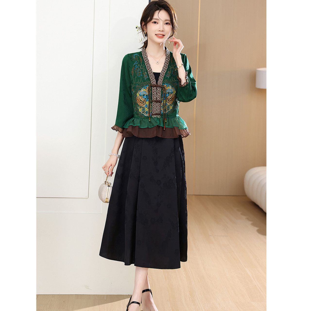 民族风刺绣V领套装裙女2024夏装时尚年轻复古改良汉服两件套